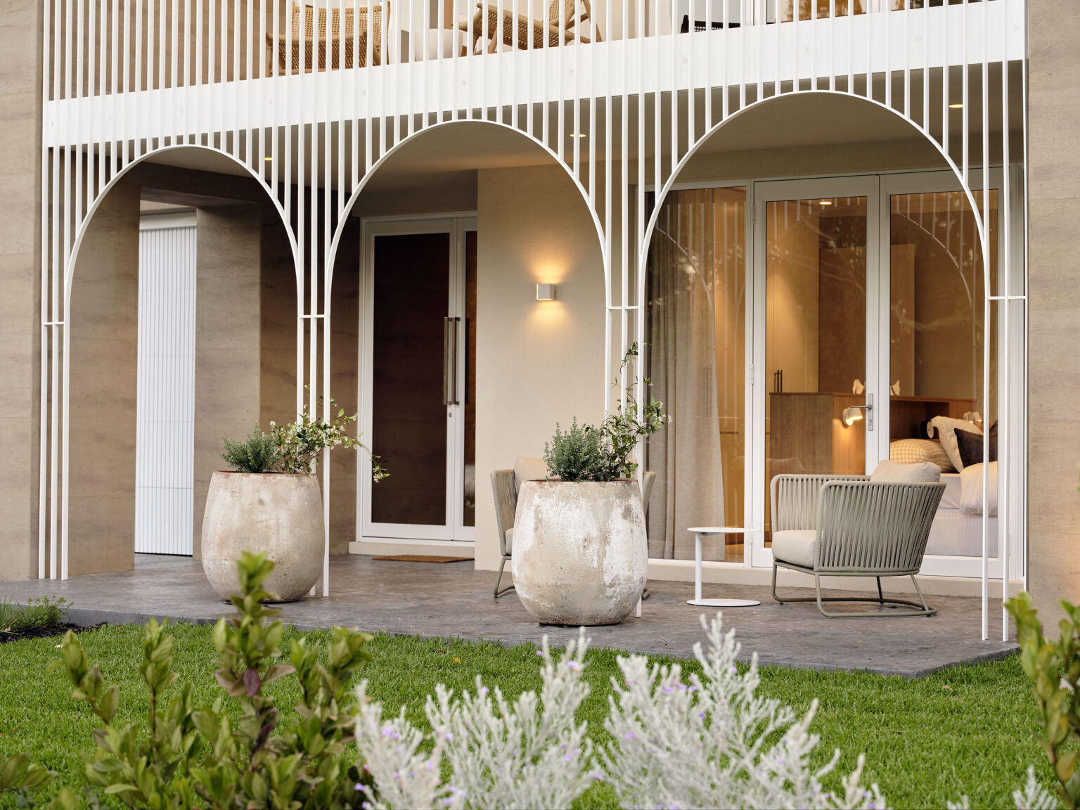 The striking facade features large, arched openings punctuated by vertical screens, delicately echoing a timeless urban charm. Inside, the architecture is characterised by natural materials such as wood, rammed earth plaster, and earthy tones, paired with contemporary fixtures.